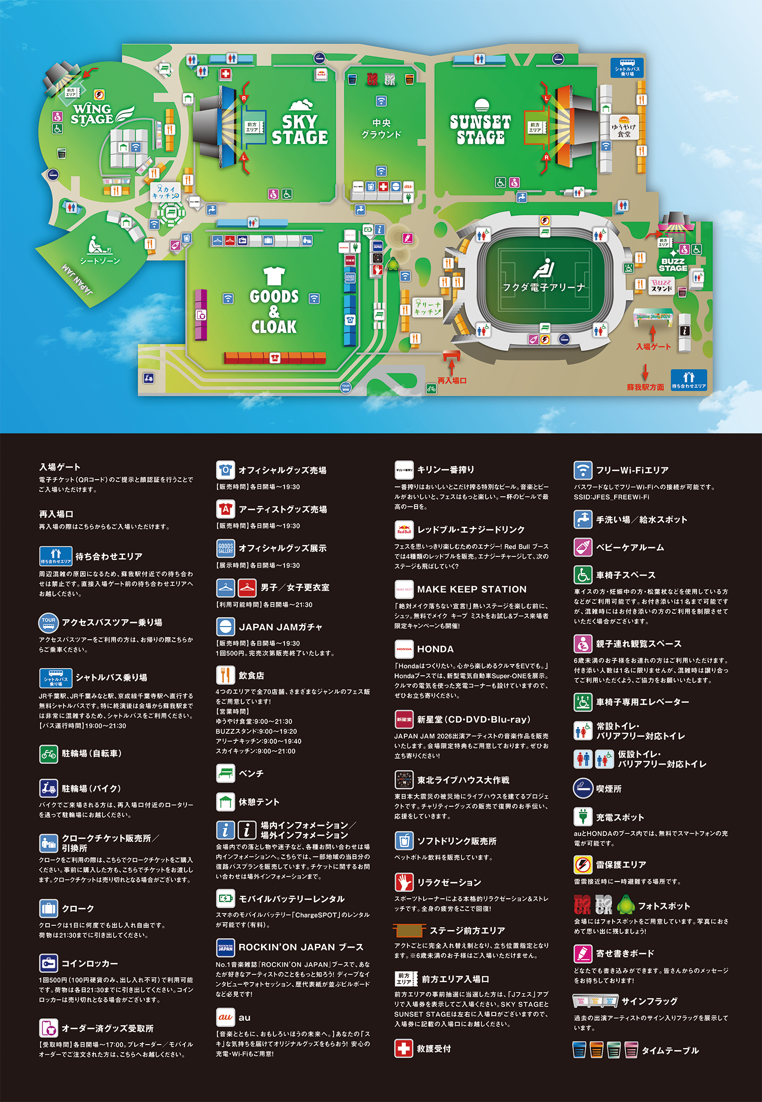JJAPAN JAM 2026では、一部エリアにシートゾーンを設定します。シートは指定されたエリアでのみ使用可能です。テント・タープ・テーブル・イスの持ち込み・使用は禁止です。また、荷物を置いての場所取りはおやめください。放置された荷物は、スタッフが見つけ次第撤去いたします。