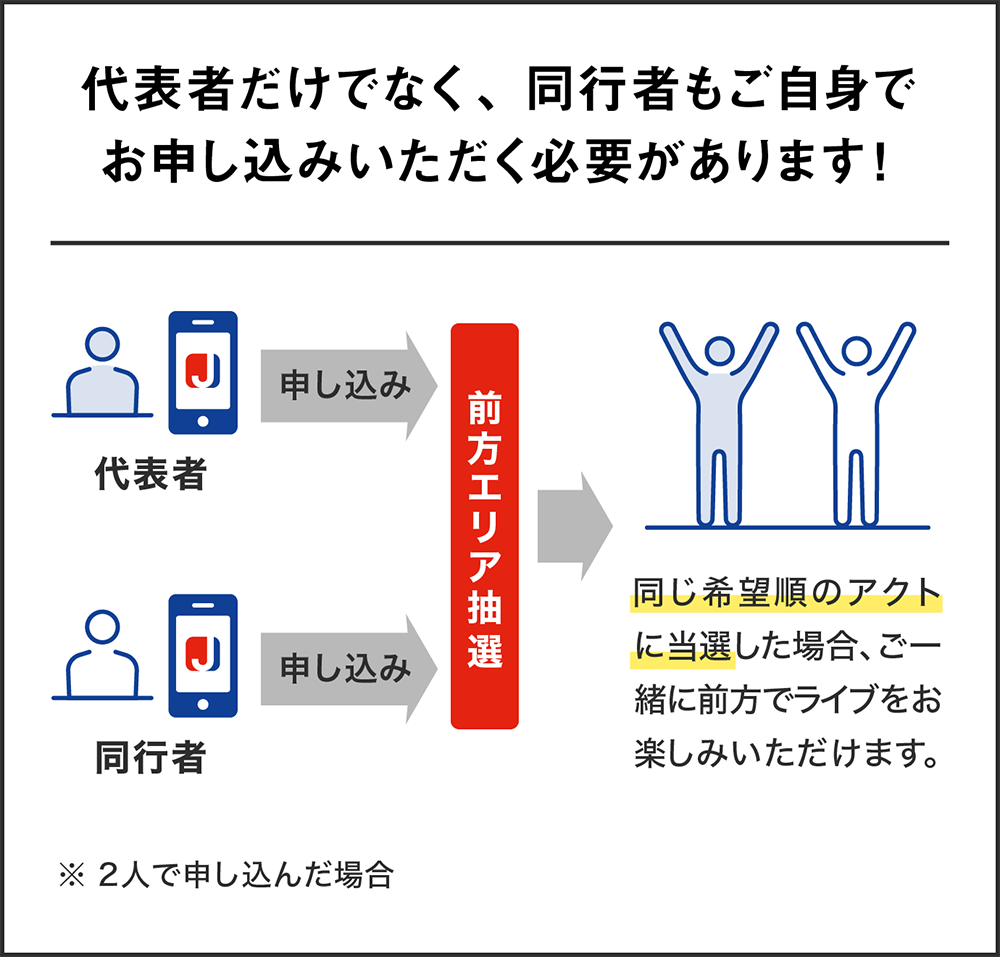 代表者、同行者問わず【ご自身の分のみ】をお申し込みいただきます。まとめてのお申し込みはできませんので、前方エリアでの観賞を希望される方は必ずそれぞれでお申し込みいただく必要がございます。お申し込みのなかった方は抽選対象とはなりません。