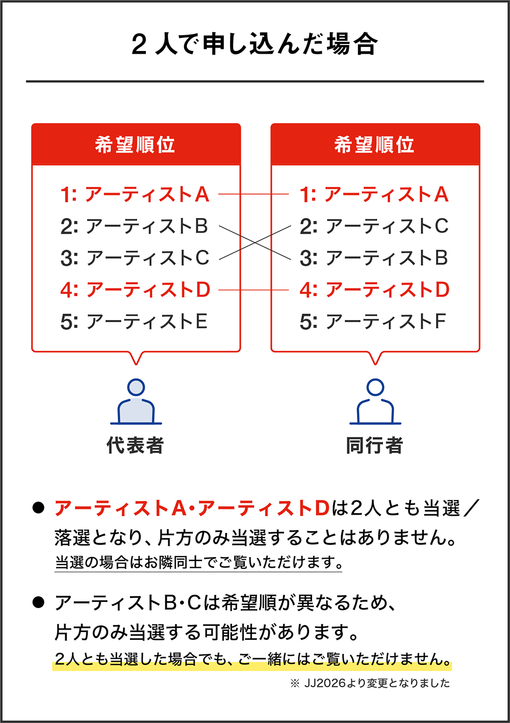 - 代表者と同行者、もしくは同行者同士が同じアクトに異なる希望順にてお申し込みいただいた場合、当落が分かれる可能性がございます。また、当選した場合でもお隣同士でご観賞いただくことはできません。