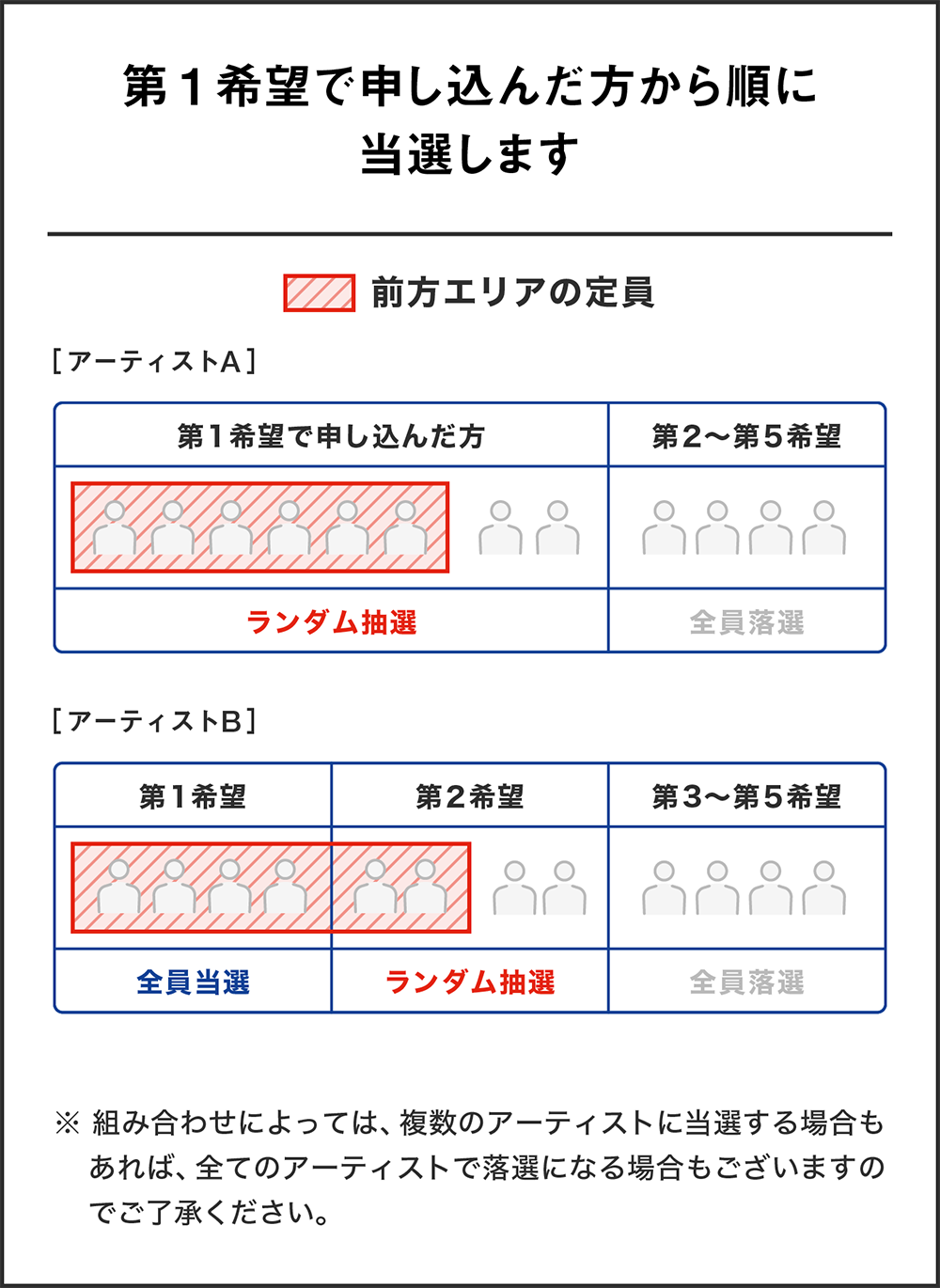 - 前方エリアには、できる限り空席を作りたくありません。観賞希望のアクトが複数いる場合は、すべてお申し込みください。なお、希望アクト数は抽選結果に一切関係ございません。