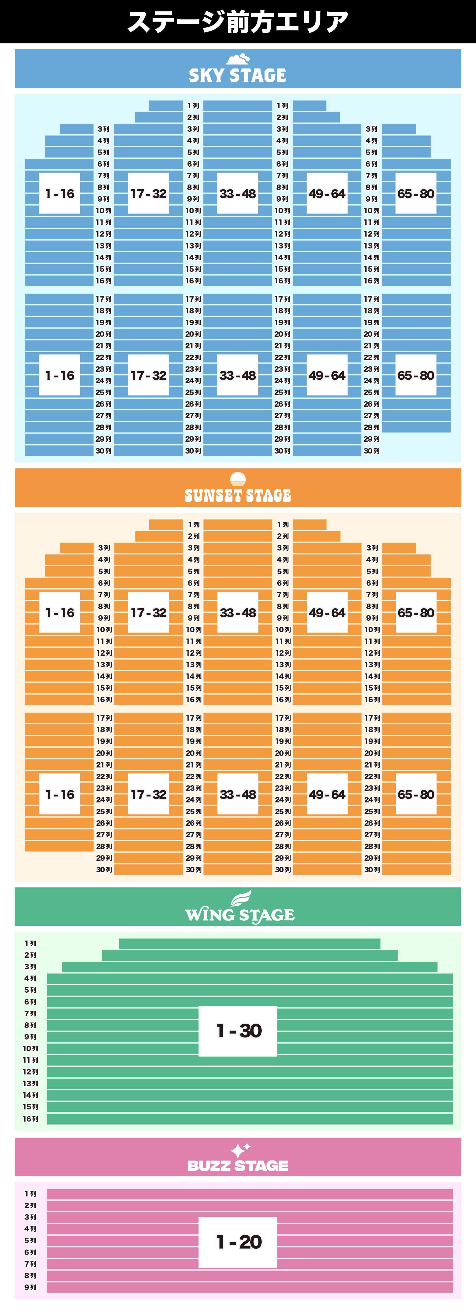 前方エリア内はオールスタンディングとなり、立ち位置を指定させていただきます。SKY/SUNSET STAGEは約2,200人、WING STAGEは約450人、BUZZ STAGEは約200人が入場可能です。